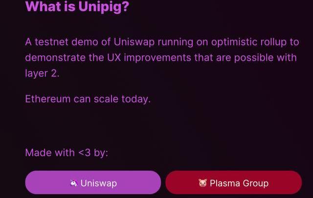 Unipig是一個早期的Demo,由Uniswap+Optimism(或者曾經的PlasmaGroup)團隊共同開發,展示Uniswap+Layer2(Optimism的實現)的示例,網址是:https://unipig.exchange/。