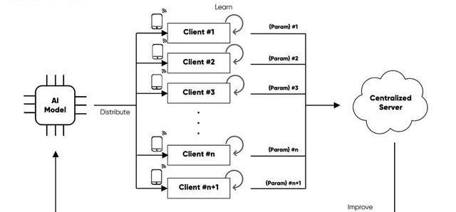 *聯邦學習是一種通過將原始模型分布在多個原生客戶端上,使用存儲的數據對其進行訓練,然后在中央服務器上收集學習到的參數的方法,用于訓練人工智能模型。