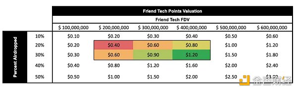 Friend tech 將在接下來的 6 個月內向平臺用戶獎勵 1 億積分。下面是一個表格,根據發行估值和空投代幣供應的百分比,估計每個積分的價格。