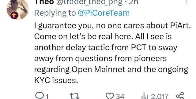 用戶的推文是這樣寫的,“我向你保證沒人在乎PiArt。拜托,現實點吧。我所看到的是另一種拖延戰術從PCT搖擺遠離問題的先驅關于開放主網和正在進行的KYC問題。”