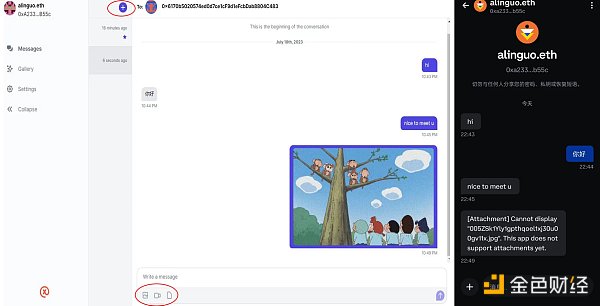 左圖為Lens界面,右圖為CoinbaseWallet界面。目前測試兩者間消息即時性較強。通過左圖底部紅圈標注部分也可以看出,除了消息傳遞,還可以發送圖片、文件等。不過CoinbaseWallet暫不支持文字之外的功能。
