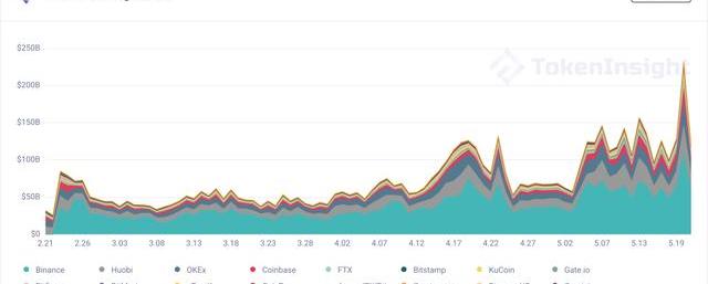 現貨市場方面,5月19日出現了自1月初以來的第二次交易高峰:在價格下跌次日,比特幣成交量達到456.4億美元,全市場通證現貨成交量則達到了2323億美元。似乎出現了拋售潮;但并不是如此。在大量散戶選擇賣掉數字資產的同時,大量歐美投資機構與意圖“抄底”的散戶選擇了在低位買入,當日大量的買入賣出操作推升了成交量,當然也對交易所造成了一定沖擊:Binance、Coinbase均因交易數據處理與清算量過大而出現了不同程度的交易擁堵與宕機。但是,在流動性提供者、做市商、量化對沖基金、交易所、乃至于個人投資者的多方合力下,數字資產市場流動性并未受到顯著影響。