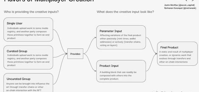 多人創造工具能夠通過將任意鏈上互動轉變為一種自我表達形式,將被動消費者轉變為創造者。這些工具還通過更緊密的制作前反饋循環和發行后互動,使藝術家比以往更接近他們的觀眾。區塊鏈和平臺無關的標準為創造性作品增加了來源和可組合性,使社區能夠以以前不可能的方式采樣,重新混合并在文化上留下自己的印記。