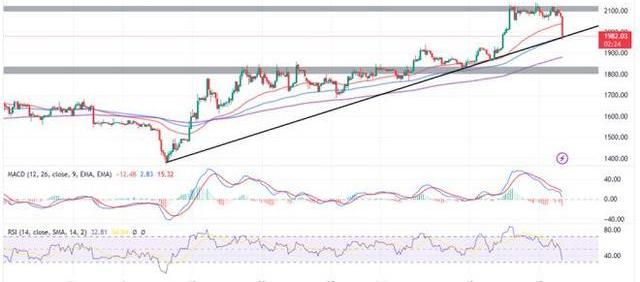 自2022年5月以來首次攀升至2,140美元后,以太坊又回到了2,000美元以下的交易價位。如日線圖所示,多頭試圖維持2,000美元的短期支撐的嘗試失敗了,現在ETH的交易價格為1,982美元,同時在關鍵的上升趨勢線尋求支撐。