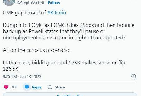 XRP/HKD-2.78%比特幣在周末CME期貨缺口接近26,500美元后幾乎立即回落。