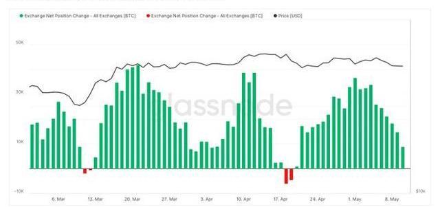 交易所凈頭寸變化的總體視圖描繪了BTC凈流入交易所錢包的21天窗口下降。