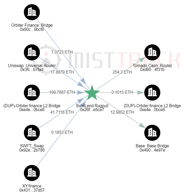 2023 年 8 月 16 日,借貸協議 SwirlLend 團隊從 Base 盜取了約 290 萬美元的加密貨幣,從 Linea 盜取了價值 170 萬美元的加密貨幣,被盜資金均被跨鏈到以太坊。截至目前,部署者已將 254.2 ETH 轉移到 Tornado Cash。SwirlLend 官方 Twitter 和 Telegram 帳戶已經注銷,其官方網站也無法訪問。據 MistTrack 分析,部署者使用了 SwftSwap、XY Finance、Orbiter Finance 等,同時,發現了如下 IP:50.*.*.106、50.*.*.58、50.*.*.42。