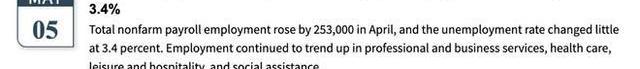 據美國政府官方網站數據,美國4月非農就業人數增加了25.3萬人,超過修正后3月前值16.5萬,遠超預估增額18.5萬。而失業率并沒有較大變化,從在3.4%,但錄得今年1月以來新低。