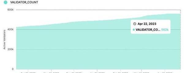 上海升級后,以太坊鏈上活躍驗證者數量略微減少,從562,782降至561,655個。