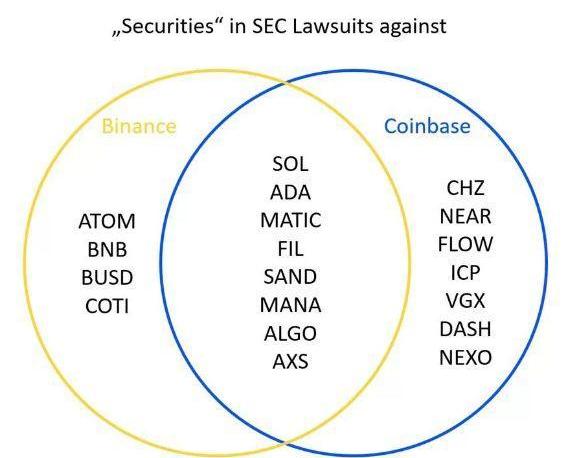 卡爾達諾、索拉納、幣安幣,據美國證券交易委員會稱,其采取行動并引起了巨大爭議,分別于6月5日和6月6日分別對幣安和Coinbase提起訴訟,主要是出售未注冊證券、幣安美元(BUSD)、Decentraland(MANA)和Filecoin(FIL)屬于19種山寨幣證券類別。SEC將這些山寨幣視為安全類這一事實意味著數百甚至數千種山寨幣也屬于此類。