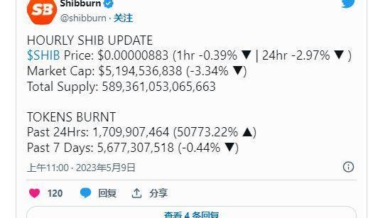 Shibburn.com信息稱,代幣投資者在過去24小時內銷毀了1,699,451,700SHIB。這個巨大的項目在過去24小時內將SHIB的整體銷毀率提高了12199.82%。