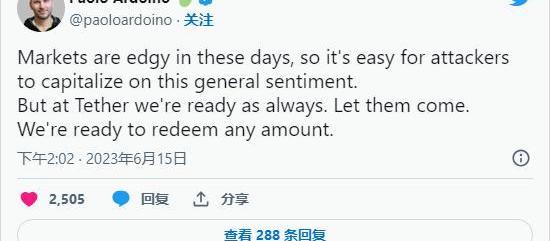 盡管幣圈存在多個隱憂,但USDT的發行暨營運公司Tether,技術長保羅·阿多伊諾在一條推文中向客戶保證,「一如既往地」準備好現金贖回這些USDT。