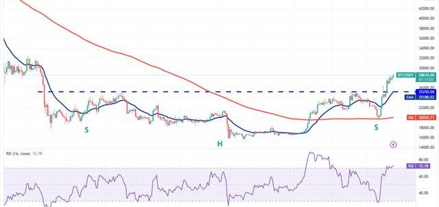 向上傾斜的20天指數移動平均線或EMA和超買區域的相對強度指數或RSI表明阻力最小的路徑是上行。突破28,500美元將為可能反彈至30,000-32,500美元的阻力區域開辟道路。如果出現修正,首先要關注的下行支撐位是25,250美元。如果價格從該水平反轉,則表明頭肩頸線(H&S)形態已轉為支撐。如果25,250美元的水平被打破,就會出現問題。因為這可能會觸發一些牛市止損。BTC然后可能會跌至200天簡單移動平均線或SMA。