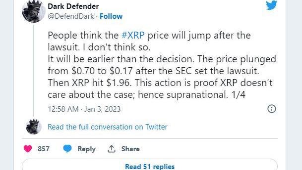 據Defender稱,在SEC提出申訴后,XRP的價格飆升至1.96美元,較之前的0.17美元大幅上漲。辯護人認為,這種行為證明瑞波幣不受訴訟影響,因為它是超國家的,不受任何一個國家或其政府的約束。