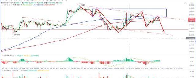 在從4h的走勢圖中,也受到前方中樞壓制,不管后面會不會突破3.1w,但目前可以說是,空頭為主,現在處于下降趨勢中,要想反轉,需要很強的多頭情緒。雖說日線k線形態處于5日均線之上,但內部次級別走勢偏空為主,可能會帶動日線級別下跌,估計今晚凌晨走完,大致就知道后期多空是哪方力量強勢。整體來看,就是3w上方壓力很大,下方2,7w支撐很強,個人觀點,現在偏空為主。