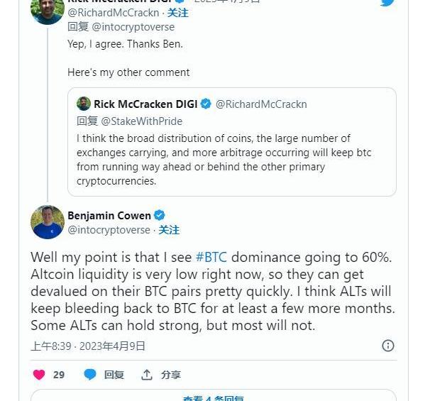 我的意思是,我看到BTC的主導地位上升到60%。山寨幣的流動性目前非常低,因此它們在BTC對中的價值可能很快就會下降。對于山寨幣,我認為它至少還會繼續流回BTC幾個月。一些山寨幣可能會保持強勁,但大多數不會。