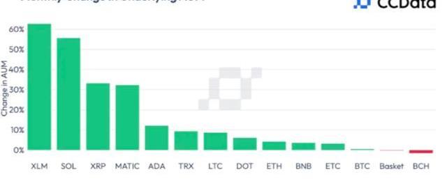 根據CCData的一份報告,7月份Stellar的XLM、Ripple的XRP和Solana的SOL相關共同基金的管理資產(AUM)有所增加。