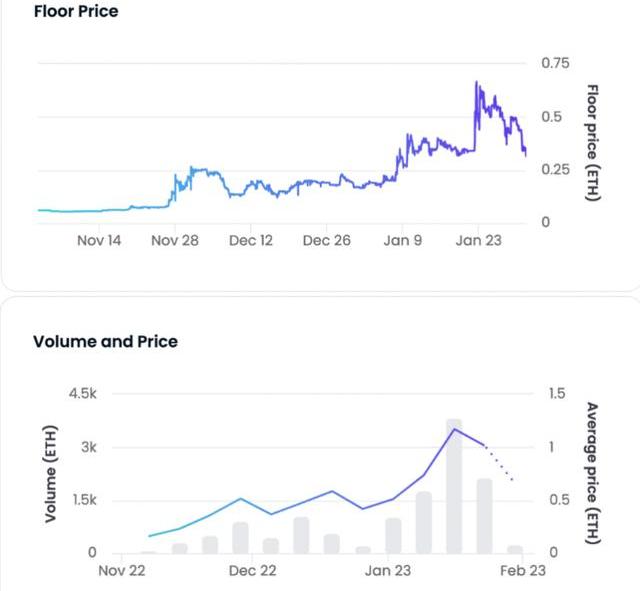 NFT系列在過去三個月經歷了大規模的牛市。所有NFT的綜合市值從2022年11月的2.7KETH反彈到今天的近50K,漲幅超過17倍。綜合市值在2023年1月23日創下了71.8KETH的歷史新高。與此同時,持有NFT的單一錢包數量也從同期的3.5K增加到6.2K,增長了76%。
