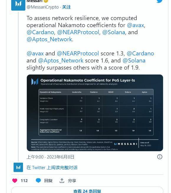 市場情報公司Messari在一條推文中表示,Solana是最具彈性的網絡之一。根據推文,該公司計算出Solana網絡的中本聰運營系數為1.9。Messari還在他的推文中透露了Avalanche(AVAX)、Cardano(ADA)、NearProtocol(NEAR)和Aptos(APT)的可操作中本聰系數。Messari強調,所有這些網絡的彈性都不如Solana。