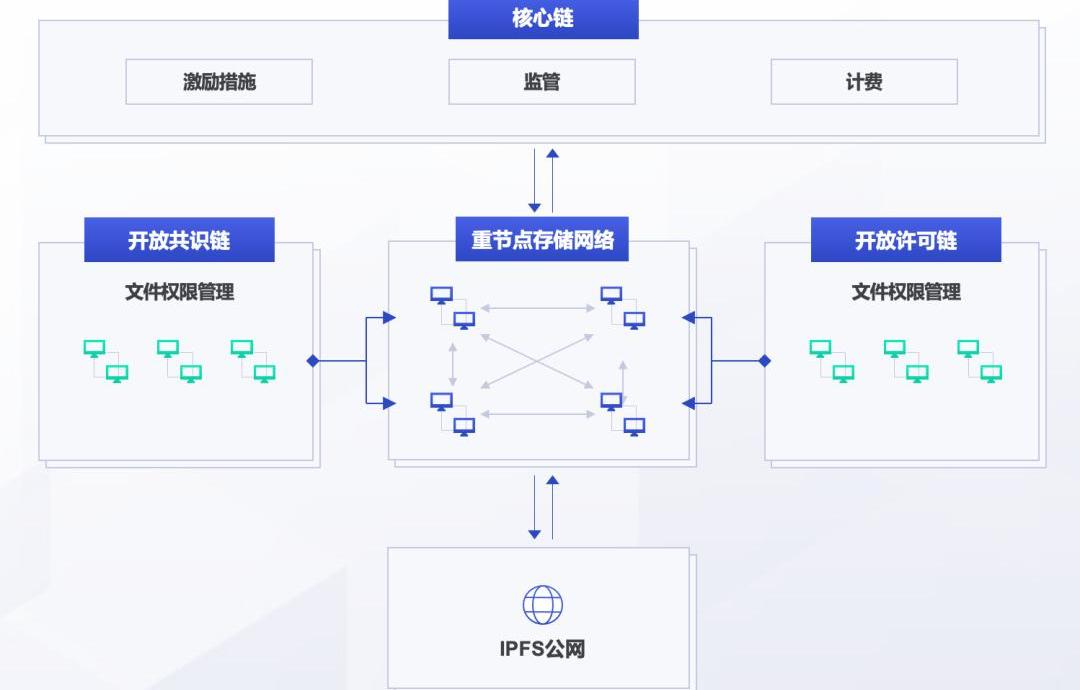 文件服務層:包含了3大模塊,并集成了許可IPFS存儲網絡,為區塊鏈層提供數據支持,可實現文件的去中心化永久存儲、權限管理和版本管理。同時,可以保存各類區塊鏈應用數據,例如:將NFT的原數據存儲在IPFS網絡中,實現數據永久存儲,不可更改,公開透明,可查詢。