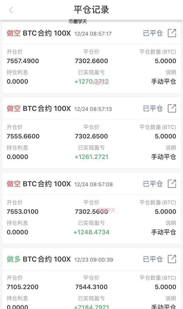 前幾日擎天就有提到多頭情緒處于逐漸衰弱階段,行情不斷向上沖刺,終究會遇阻回落;而在今日凌晨之時,行情先是向上拉升,達到至高點位7689后遇阻回落,向下回調休整,現已回到7300一線震蕩運行;這與擎天給到的點位操作正好相輔相成,若是能跟上筆者思路操作的幣友,必定會多空雙收,賺的盆滿缽滿。下圖是指導做單盈利圖。想跟上步伐的幣圈可以跟擎天線上交流探討。