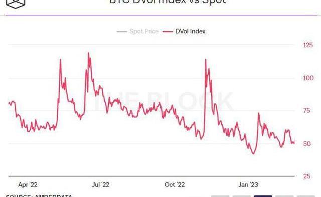 盡管擔心美聯儲收緊預期的進一步鷹派重新定價可能會引發新的加密貨幣市場波動,但比特幣期權市場繼續表明價格風險仍然有限。例如,根據TheBlock提供的數據,Deribit的比特幣波動率指數(DVOL)周二保持在51不變,仍比1月份創下的歷史低點42高不了太多。Deribit是加密貨幣衍生品的主要交易所。