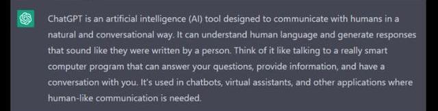 但ChatGPT到底是什么,為什么會在全球范圍內引起如此轟動?ChatGPT自己的回答是這樣的:ChatGPT是一個人工智能(AI)工具,旨在以自然的對話方式與人類進行交流。它可以理解人類語言并生成看起來像是人的回答。把它想象成與一個真正智能的計算機程序進行對話:它可以回答您的所有問題、提供信息并與您交談。它可用于聊天機器人、虛擬助手和其他需要人類交流的應用程序。