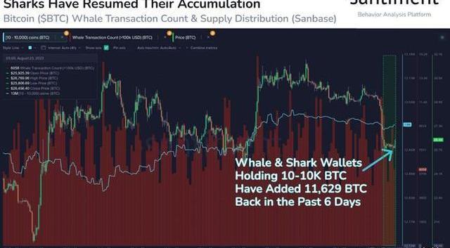 鏈上數據顯示出一些樂觀情緒,比特幣鯨魚在上周拋售后重新開始行動。鏈上數據提供商Santiment解釋說,隨著重要的鯨魚和鯊魚地址再次增加其持有量,比特幣周三飆升至2.68萬美元的峰值。自8月17日以來,在持有10至10,000BTC的156,660個錢包中,他們總共籌集了3.086億美元。