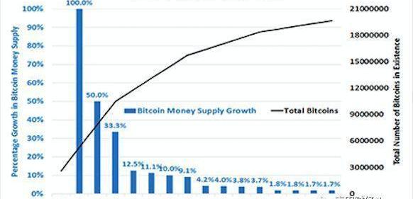 2009年,比特幣剛剛出現時,其挖礦供給以爆發性的速度增長。2017年,這一速度放緩到了4.2%左右,2020年以后則會下降到每年2%以下。到2140年左右,最后一枚比特幣將被挖出,使比特幣的總量達到2100萬。