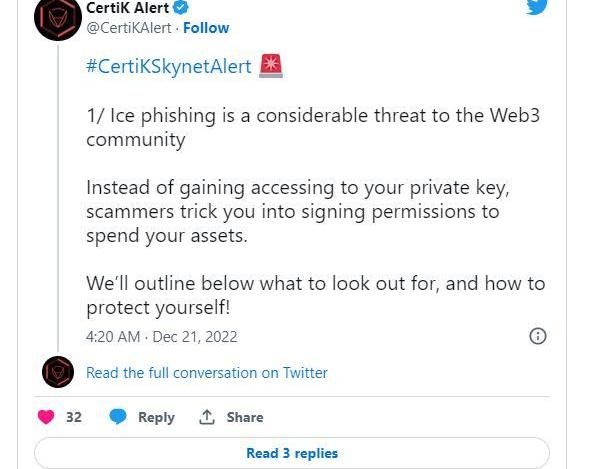 在12月20日的一份分析報告中,CertiK將ice網絡釣魚詐騙描述為一種攻擊,它會誘騙Web3用戶簽署權限,最終允許詐騙者花費他們的代幣。
