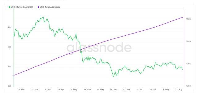 萊特幣在8月26日的市值為37.3億美元,總地址為1.51億。如果我們將市值除以總地址,我們發現每個地址的網絡價值為24美元。