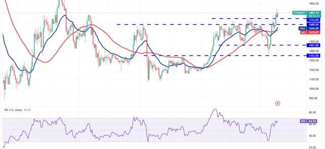 下行需要關注的關鍵支撐位在1,680美元和20日均線之間。如果價格從該區域反彈,則表明市場情緒轉為積極,交易員逢低買入。然后買家將嘗試再次恢復上升趨勢并將價格推向下一個目標2,000美元。該水平可能是多頭跨越的主要障礙。相反,如果價格下跌并跌破移動平均線,則表明多頭已經失去了主導地位。然后山寨幣可能跌至1,461美元。