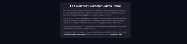 另外,一個追蹤FTX破產流程的債權人相關帳號,在昨晚分享了預定會開啟的FTX官方索賠網站。該網站的公告與債權人委員會的說法相差不大,但最后一段提到,網站預計在7月3日啟動,但前提是法院通過核準FTX提出的動議。