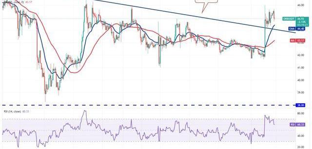 與這一假設相反,跌破下降趨勢線將表明任何啟動上升趨勢的嘗試都已消退。如果空頭將OKB/USDT貨幣對跌破移動平均線,他們將獲得更大的力量。該貨幣對隨后可能跌至41美元。四小時圖顯示,空頭正試圖將價格推低至下降趨勢線以下,但多頭已成功守住該水平。這表明買家已將看跌趨勢線轉向支撐位。該貨幣對最初可能反彈至46美元,如果這一障礙被清除,下一個目標可能是48美元。20日均線是值得關注的重要支撐。如果該水平落后,該貨幣對隨后將跌至42美元。