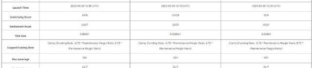 從最初的公告開始,幣安合約交易平臺將于3月30日推出三款杠桿率高達20倍(20x)的新USDT保證金永續期貨合約。這些合同將包括AMB、LEVER和TLM。根據交易所公告,合約的規格,包括最小變動幅度和保證金要求,可以根據市場情況進行調整。此外,用戶可以使用多資產模式在多個保證金資產之間交易這些合約,這允許他們使用BTC作為AMBUSDT永續期貨合約的保證金,但須遵守適用的扣除額。您可以在下表中查看新增內容的詳細信息: