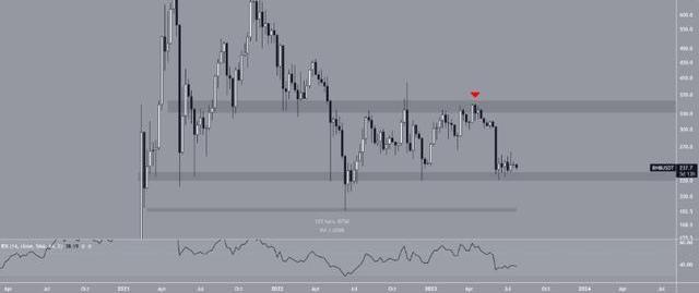 我們認為BNB存在下跌風險,但不會像Capo那樣崩潰。自2022年5月以來,BNB價格一直在225美元至350美元之間波動。在此期間,它多次觸及該范圍的上部和下部。這些改動證實了該范圍的有效性。