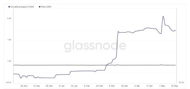 而Binance和OKX雙雙青睞的TUSD的市值再次出現小幅增長,截止到今天早晨八點的24小時內上漲了1,600萬美金,而這兩天的上漲很有可能和OKX的TUSD質押補貼有關,看來TUSD這次的策略確實不錯,在籠絡Binance的時候和OKX也保持著很好的關系。截止到目前四個主力穩定幣的市值仍然是在持續的降低,而按照這樣的降低幅度,最多還有三個月總市值就不足以將BTC和ETH推到歷史高點了。