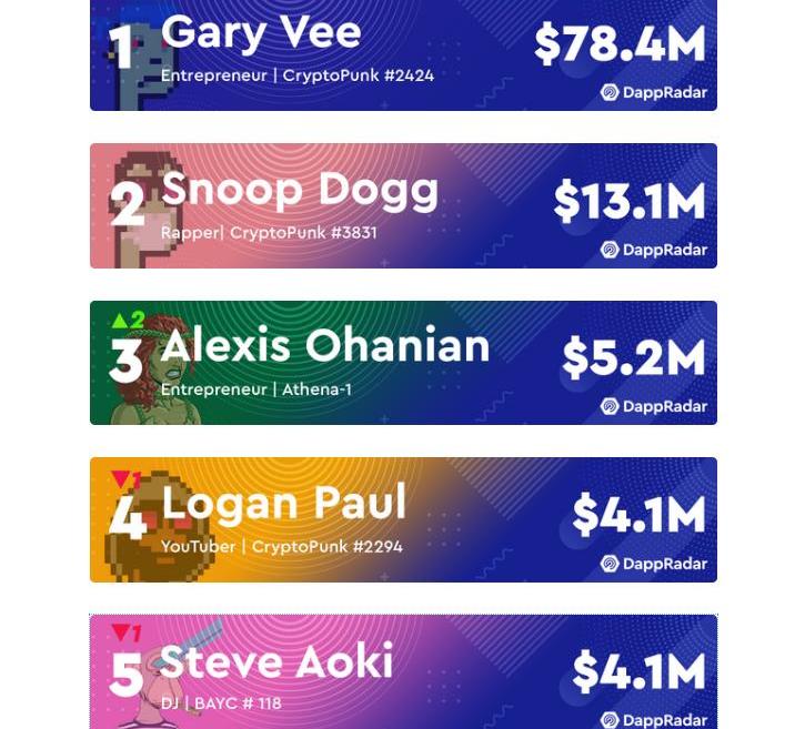 DappRadar博客文章曾列出前10大最有價值的名人NFT投資組合。其他值得關注的名人包括Reddit聯合創始人AlexisOhanian、YouTube網紅LoganPaul。