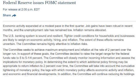 2023年5月的升息會議,在今晨2點正式公布結果,美國聯邦公開市場委員會確定調高基準利率1碼,這是央行自2022年3月開始升息以來的第9次升息,此次上調將使基準利率上升到5%至5.25%的目標區間,為2007年8月以來的最高水平。