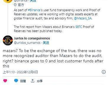 CryptoTwitter主要對Binance的審計做出積極回應。然而,有人批評幣安選擇相對不知名的公司Mazars作為審計師。