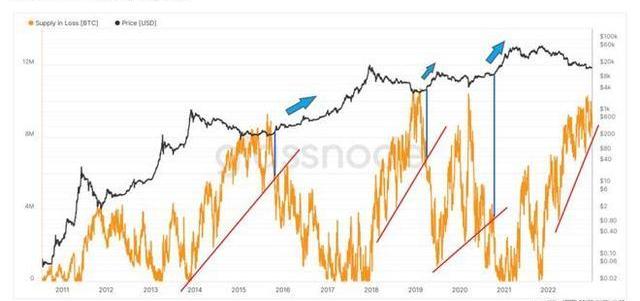 虧損的循環供應是前面提到的指標的對應物。反向指標衡量購買價格高于當前價格的硬幣數量。從邏輯上講,該指標的高點幾乎與價格的低點重合。此外,隨著可用供應量的不斷增加,損失的代幣數量在此期間繼續增加。