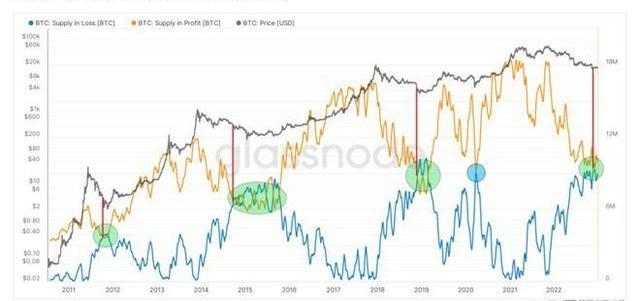 然而,這兩個指標在少數情況下重疊-虧損的硬幣多于盈利的硬幣。顯然,這恰好發生在比特幣價格接近宏觀底部并且隨后是增持階段時。