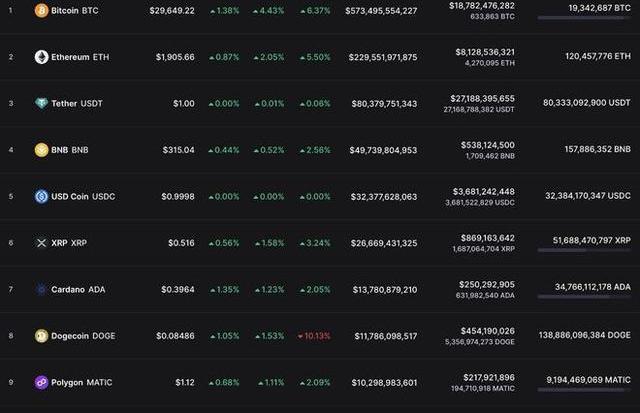 昨日晚間開始走高的比特幣,夜間加速升值,突破29700美元,創下2022年6月以來的最高價位。隨著比特幣接近30,000美元的水平,加密貨幣市場已經反彈。根據CMC數據,加密貨幣市場總值已達到1.22萬億美元的水平,而加密貨幣市場的總交易量已超過400億美元。此外,領先的加密貨幣比特幣的交易量錄得近60%的增長。在BTC上漲的影響下,加密貨幣市場上的大多數山寨幣又開始上漲。