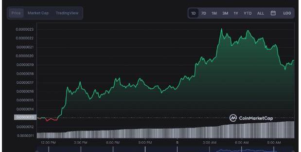最近推出的加密貨幣佩佩(PEPE)引起了很多猜測,在過去24小時內繼續以非常高的速度增值。隨著這些價值的增加,當天的PEPE從0.0000012美元上漲到0.0000023美元。根據CoinMarketCap數據,PEPE的市值已經超過8億美元。