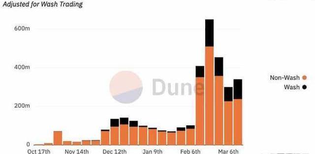 造成這種情況的原因之一可能是Blur網絡上發生的清洗交易量。根據DuneAnalytics的數據,Blur上11%的交易量是通過清洗交易發生的。