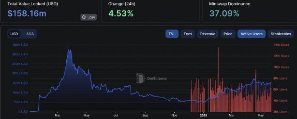 來自情報平臺DeFiLlama的數據顯示,截至5月23日,ADA的TVL為1.5816億美元。TVL在過去24小時內上漲了4.53%。此外,在撰寫本文時,網絡上的活躍用戶數量為63.31k。