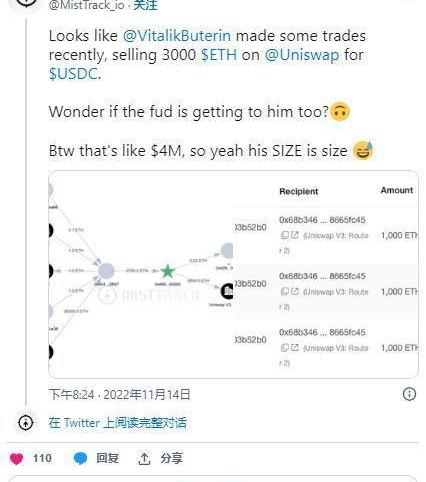 據傳為以太坊共同創辦人VitalikButerin相關的錢包,上周六透過UniswapV3分三筆交易,將3,000枚以太幣全數兌換為近400萬美元的USDC。以太坊著名開發者今日在推特稱詢問Vitalik向他確認該地址并不屬于他。