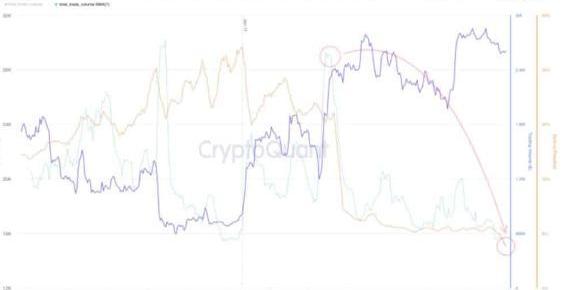 Santiment的數據顯示,BTC的積極走勢不僅受到交易者的預期,也受到BTC持有者的預期。下圖顯示比特幣的MVRV比率顯著下降。這種下降表明許多一直在積累比特幣的持有者的盈利能力下降。