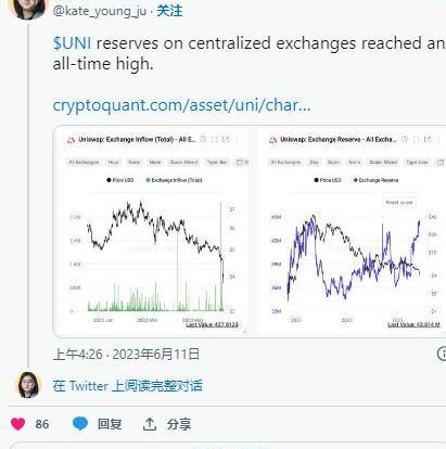 正如分析師KateYoung的數據所示,Uniswap在交易所的儲備已飆升至創紀錄水平。中心化交易所持有的UNI數量增加可以解釋為一個看漲信號。這表明對令牌的興趣和需求增加。另一方面,UNI在中心化交易所的大量儲備也可能被視為看跌。這可能是由于可能打算出售或退出頭寸。