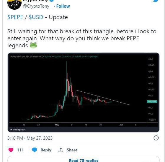 在大幅反彈之后,新推出的meme硬幣PEPE進行了廣泛的回撤。PEPE正呈三角形橫盤整理,CryptoTwitter分析師CryptoTony認為這將決定PEPE的下一個方向。